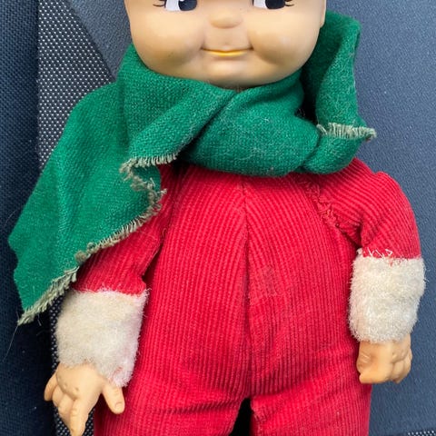 En fin ældre håndsyet dukke eller pyntepude i bomuldsstof er denne kære julepige i sit fineste tøj og med en kurv fuld af kristtjørn – perfekt til at sprede lidt julehygge i sofaen eller som krammedukke til familiens mindste.