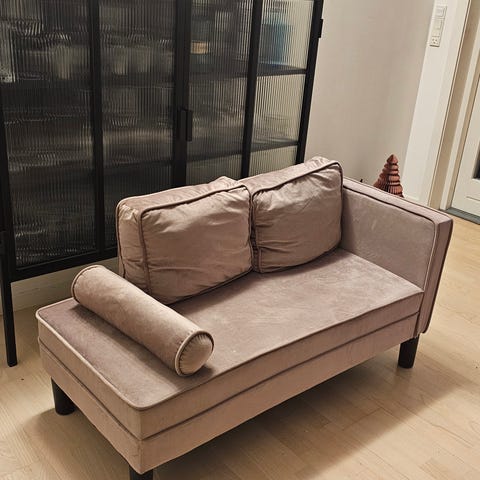 Fin og let børnechaiselong/sofa i rosa/lille farve med 2 hynder og en “rullepude”. Brugt meget lidt.