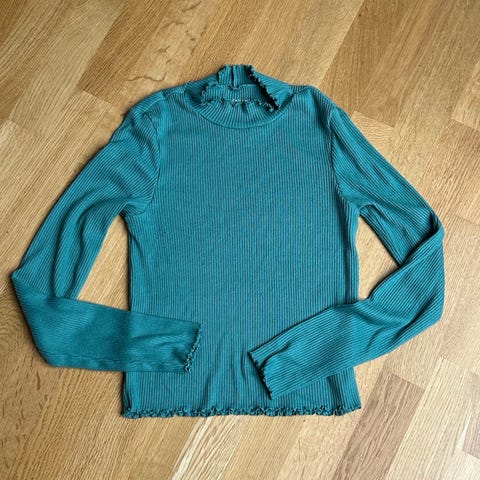 bluse i grøn farve, størrelse M. Blusen har lange ærmer og en ribstrikket tekstur med en let krave. Materialet er blødt og elastisk.