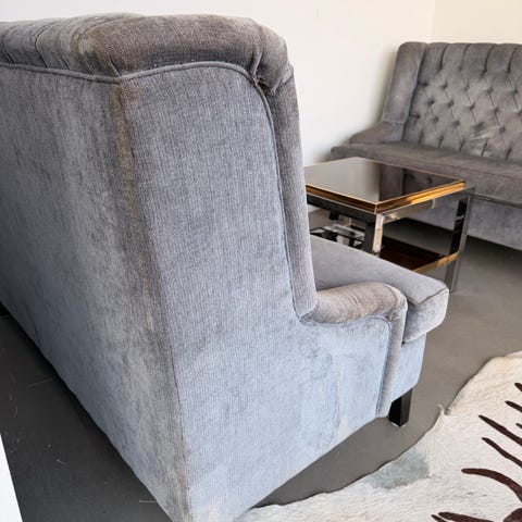 Trendy højrygget sofa betrukket med gråt møbelstof, afsluttet med stel af sortlakeret stålrør. Siddehøjde 42 cm. Kan afhentes i Nyborg på vores adresse, tæt ved motorvejen. Kontakt mig på mobil 29990387 for nærmere. Levering til adresse er også mulig, mod betaling.