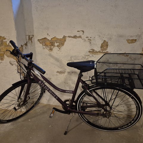 MBK Kvinde Andre cykel i hvid farve. Cyklen har en steltype til kvinder og er udstyret med standard komponenter til daglig brug. Den har en bagagebærer, støtteben og skærme, hvilket gør den egnet til bykørsel og pendling.