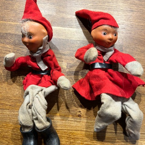 6 stk Håndlavede retro nissefigurer i rødt og blåt stof