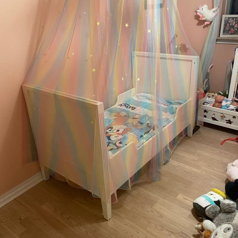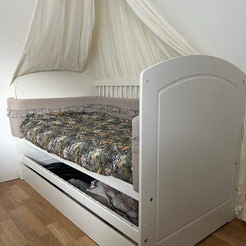 Tremmeseng med aftagelige tremmer så junior selv kan gå ind og ud af sengen . Kan derefter ombygges til almindelig seng . Sælges uden madras kan eventuelt tilkøbes