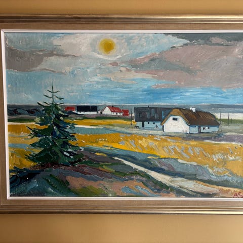 Landskabsmaleri udført i olie på lærred. Maleriet er monteret i original træramme og forestiller et landskab med marker og bygninger i baggrunden. Signatur og yderligere information ses på bagsiden af lærredet (54 cm x 25 cm). Johan Aabye betegnes som en tidlig Skagensmaler, jf. Hans Buch's bog: "Maleren Jørgen Aabye. Livet forgår - kunsten består"-