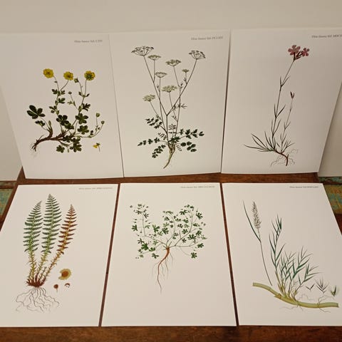 Flora Danica Plakat Sæt bestående af 4 plakater. Plakaterne viser detaljerede tegninger af forskellige planter og urter i naturlige farver.