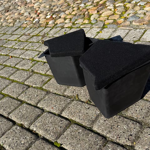 Sæt med 2 originale Tesla Model Y opbevaringskasser med låg til sidelommerne i bagagerummet.