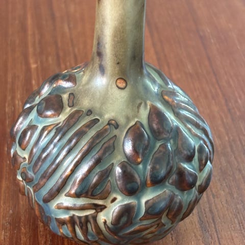 Royal Copenhagen Axel Salto Stoneware Vase i mørk farve. Vasen har en unik struktur med bulede former og en glaseret overflade. Den er lavet af stentøj og kan anvendes som dekorativ genstand eller til opbevaring af blomster.