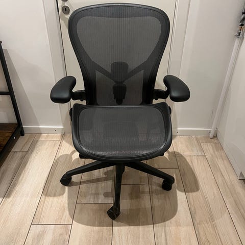 Den super ergonomiske og meget eftertragtede Herman Miller Aeron Executiv kontorstol. Den er designet af Bill Stumpf og Don Chadwick og man sidder fantastisk i den.