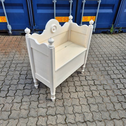 Træbænk med opbevaringsfunktion, malet i blå farve. Bænken har armlæn og rygstøtte med dekorative detaljer. Opbevaringsrummet under sædet er rummeligt og lavet af træ. Velegnet til entré eller andre rum til siddeplads og opbevaring.
