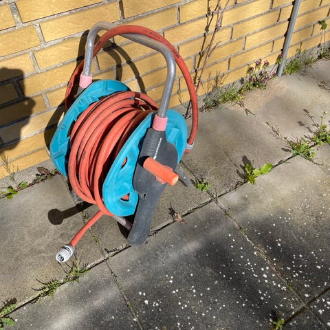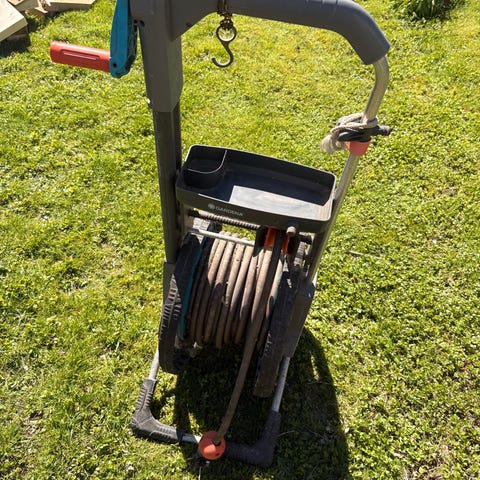 50m Gardena slangetromle med slange, hjul og håndtag til nem opbevaring og transport af havevandslange. Fremstillet i holdbare materialer, designet til udendørs brug. Velegnet til havearbejde og vanding.