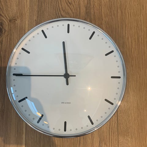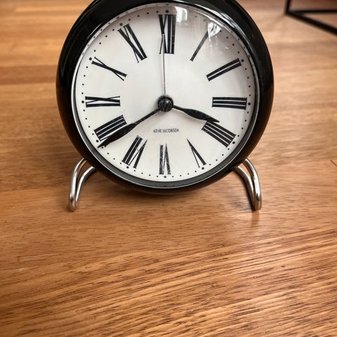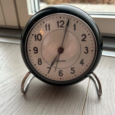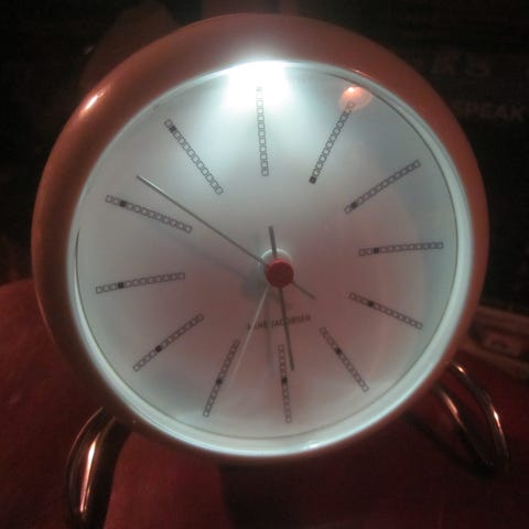Et vækkeur, man kan høre, når det ringer. Berømte designer Arne Jacobsen. Virker selvfølgelig.