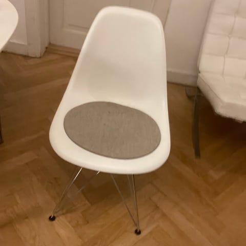 Smukke og tidløse Eames DSR stole med hvid plastskal og forkromet Eiffel-stel.