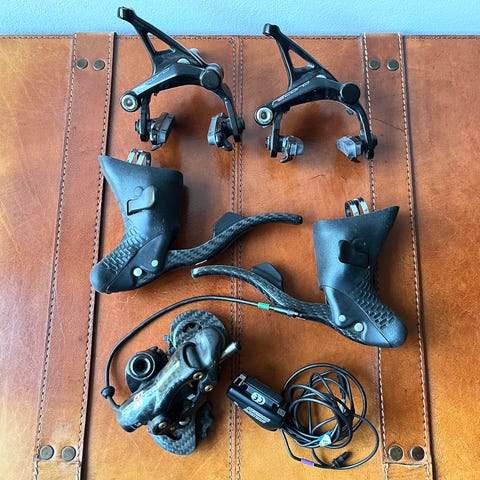 Campagnolo Chorus Carbon shifter sæt til racercykler. Sættet inkluderer højre og venstre gearskiftegreb med carbon komponenter. Grebene har ergonomisk design med sorte gummigreb for bedre kontrol. Passer til cyklister, der ønsker præcise gearskift.