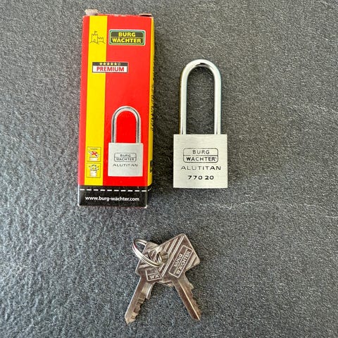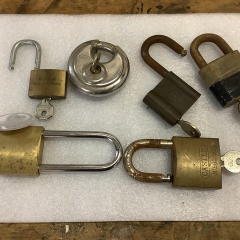 Castle hængelåse 5 stk. NOS, 5 stk. Castle kvalitets hængelåse i messing, de er gamle, men ubrugte og stadig pakket ind (new old stock). Til hver hængelås følger 3 nøgler med. Låsebolten måler 50mm. Samlet pris for de 5.