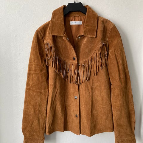 Virkelig lækker cowboyjakke i den smukkeste bordeauxbrune farve med foer i råhvid indvendigt i hele jakken. Den har rummelige lommer i hver side og brystlommer, der lukkes med knapper.