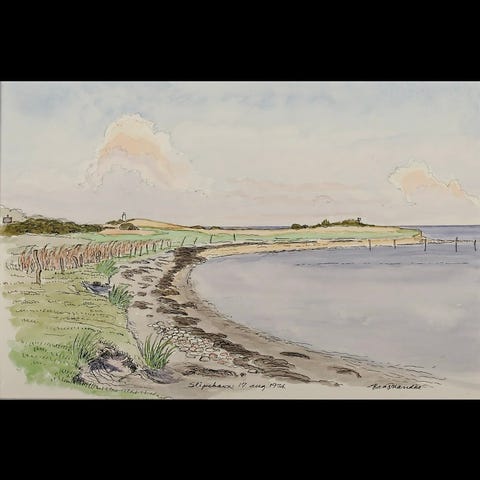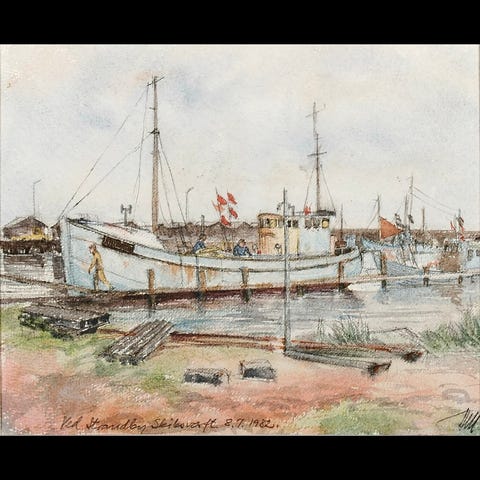 Akvarel af Slipshavn, tåge 06-11-1976 malet af Hans Mandøe
