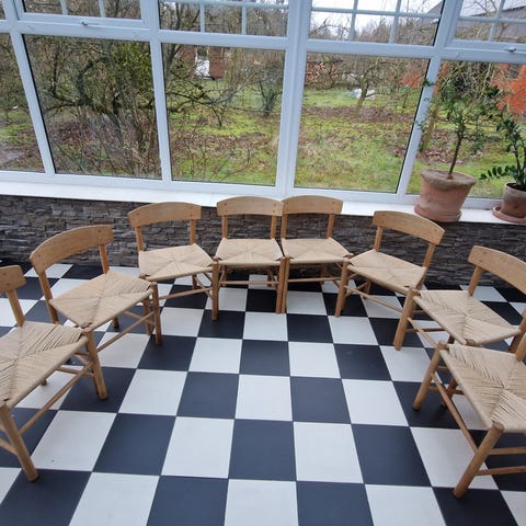 Originale BM J39 stole, i rødbejdset bøg. Nyt fletsæde af originalt papirgarn, flettet af professionel flettemand. Stolene er stemplet.