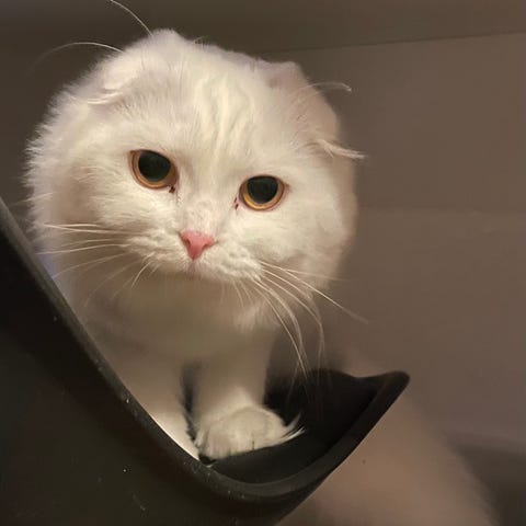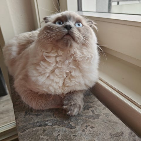 Hans mor er Britisk Langhår, og hans far er Ragdoll, så han har fået en virkelig dejlig blanding af både smuk pels og en blid, kærlig personlighed 💙