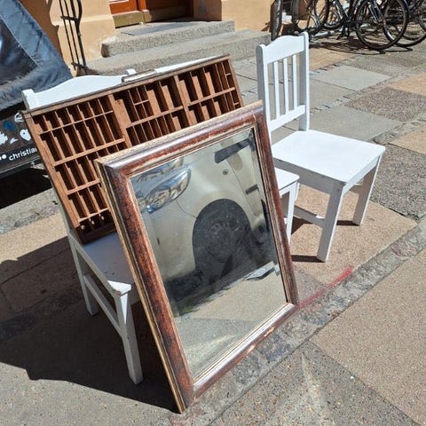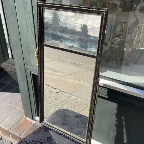 Rustikt gammelt spejl med fine udskæringer i rammen. Der er gået et stykke løs, som let kan limes fast igen uden at det vil kunne ses. Der er andre mindre fejl i udskæringen.