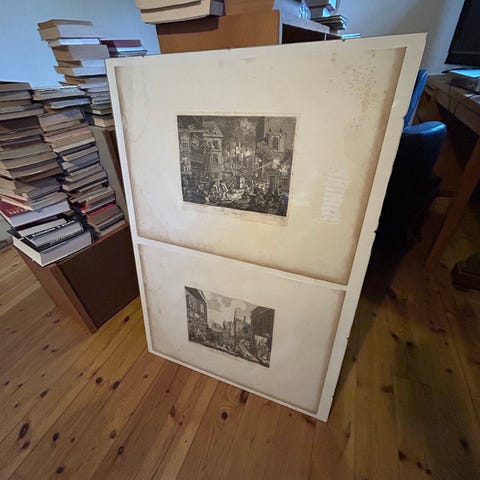 Et dekorativt og historisk interessant tryk med to af Hogarths mest dynamiske motiver — et klassisk eksempel på hans satiriske mesterskab.