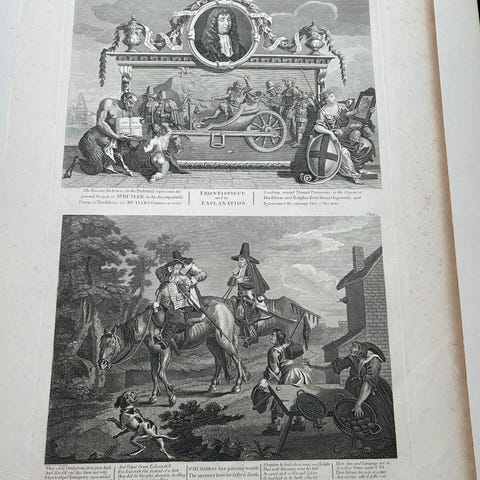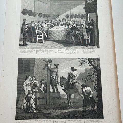 Flot og velbevaret dobbeltsidigt kobberstik med to klassiske motiver fra William Hogarths ikoniske Hudibras-serie, inspireret af Samuel Butler’s satiriske digt fra 1600-tallet.