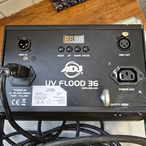 Kan styres via DMX (1 eller 3 kanaler), har auto-mode, musik-mode og master/slave.