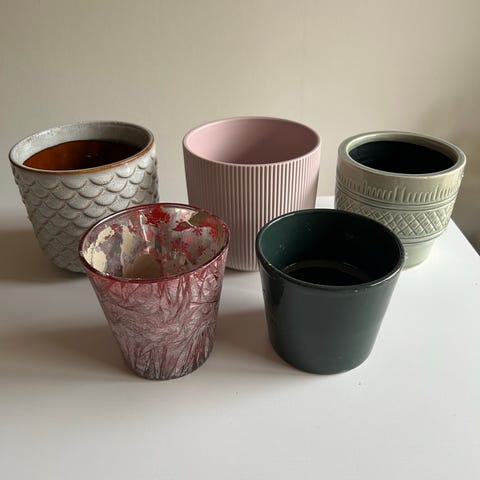 3 stk. lyse brune ler urtepotteskjulere ( 1 stk. er H: 12 cm Ø 12 cm, og 1 er H: 17 cm Ø 9 cm, og 1 er H: 8,5 cm og Ø 7 cm