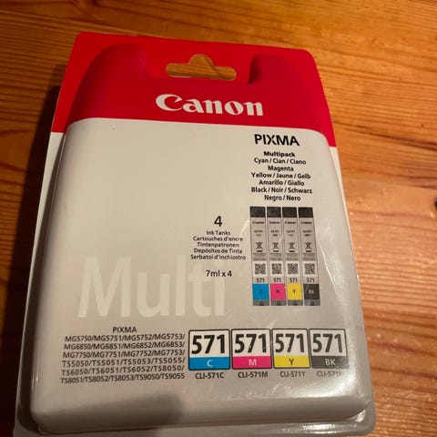 Canon PIXMA 571 Multipack Ink Tanks in colors Cyan, Magenta, Yellow, and Black. Each tank contains 7ml of ink. Compatible with various Canon PIXMA printer models including MG5750, MG5751, MG5752, MG6851, MG6852, MG6853, MG7750, MG7751, MG7752, MG7753, TS5050, TS5051, TS5052, TS5053, TS6050, TS6051, TS6052, TS6053, TS8050, TS8051, TS8052, TS8053, TS9050, and TS9055. Aldrig åbnet