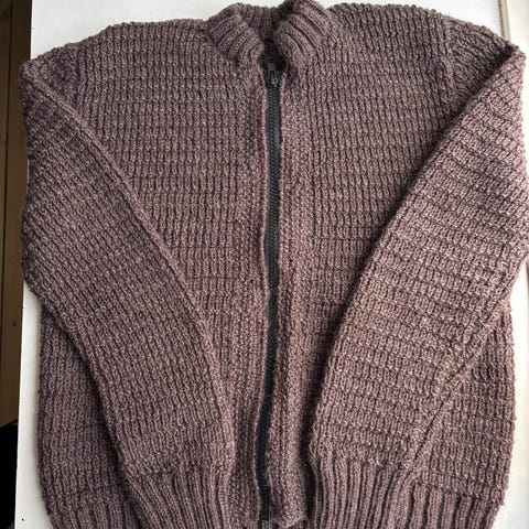 Dejlig varm strikket cardigan, 100% superwash uld, blød og behagelig. (Det barn, der har brugt den, sagde at den ikke kradsede). Med flotte irske snoninger og to stiklommer.