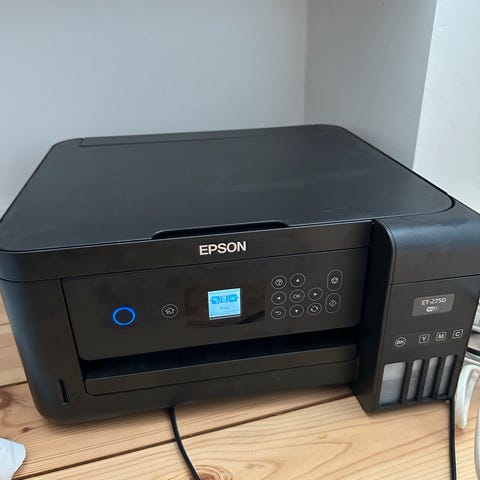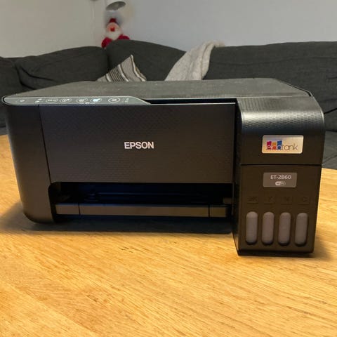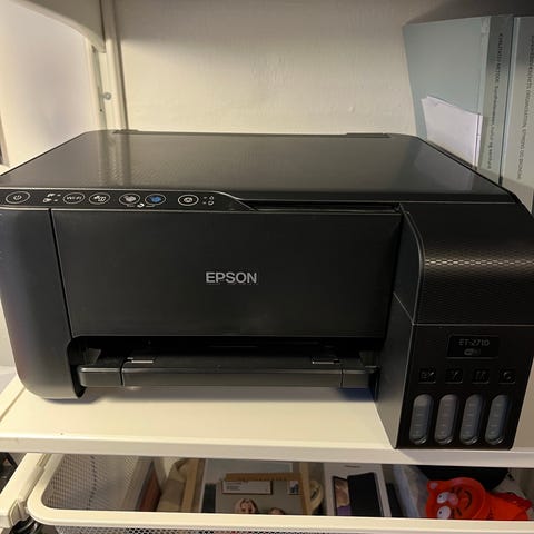 Epson ET-2710 printer med genopfyldelige blækpatroner i farverne cyan, magenta og sort. Printeren har en sort og blå farve, og er kun egnet til sort udskrift. Gul og rød virker ikke.