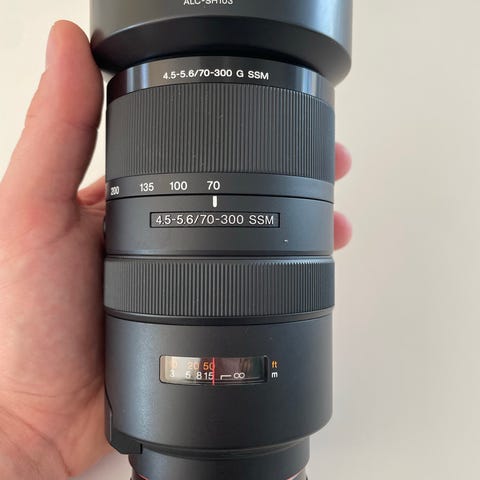 Sony zoom objektiv A mount 70-300 f 4.5 5.6 G SSM. Uden støv, uden ridser. Hurtigt og skrpt fokus. Lydløs. Fungerer som skal. Komplet. Brugt på eBay omkring 3000 kr. Medfølger: