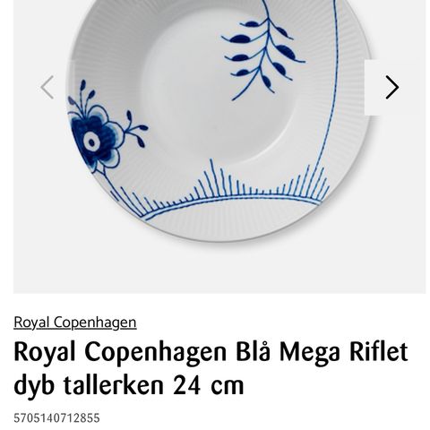 Royal Copenhagen dyb tallerken 24 cm i diam. Kr. 150,-.