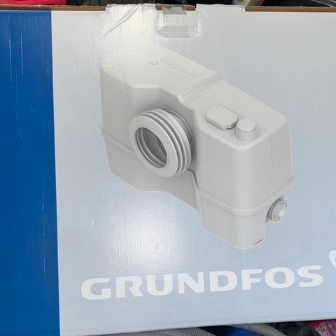 Grundfos solo lift pumpe i hvid farve. Designet til at pumpe spildevand fra toiletter i områder uden traditionel kloakforbindelse. Kompakt størrelse og elektrisk drevet, egnet til installation under eller bag et toilet.