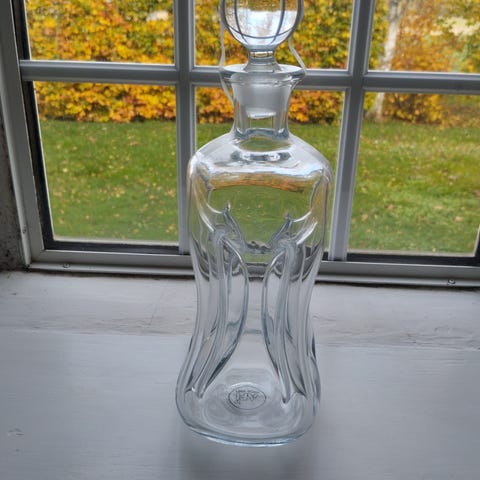 Klukflaske fra Holmegaard. 28 cm høj. Ideel til hjemmelavede kryddersnapse. Helt ubrugt.