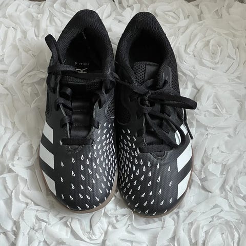 Adidas Predator indendørs fodboldsko i størrelse 41 1/3, hvid og blå. Skoene har en gummi sål egnet til indendørs brug. Designet til unisex brug.