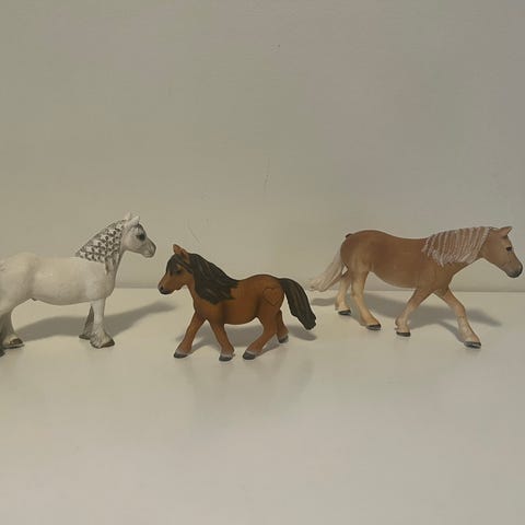 Sæt bestående af 6 forskellige heste, 2 mennesker, 1 vaskeplads og forskelligt tilbehør som f.eks. skovl, spand og seletøj.