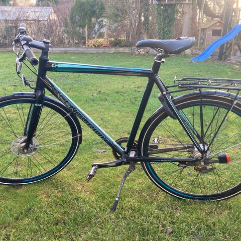 Centurion Citycykel til herrer med 28 tommer hjul. Cyklen har en sort ramme og er udstyret med en gearvælger på styret. Den har bagagebærer og skærme, hvilket gør den egnet til daglig transport og pendling.