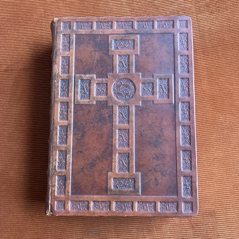Meget gammel bibel , bind i sort velure, meg gulg tryg.