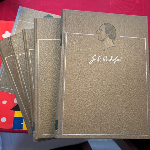 Samling af bøger af H.C. Andersen med forskellige titler og udgaver. Bøgerne omfatter både eventyr, biografier og litterære værker relateret til H.C. Andersen. Varierende størrelser og omslag, primært på dansk.
