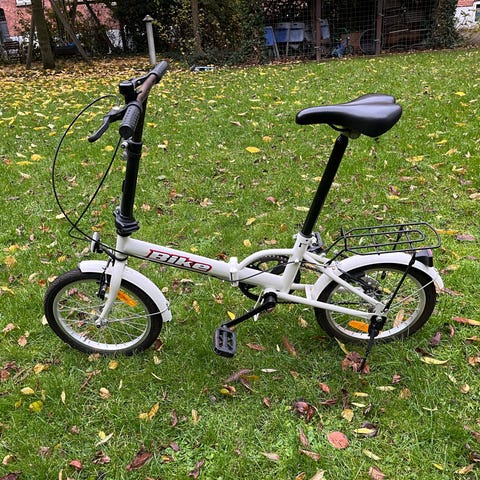 Foldbar bycykel i rød farve. Cyklen har en kompakt ramme med foldemekanisme, hvilket gør den nem at transportere og opbevare. Egnet til at medbringe i båden eller i campingvognen.