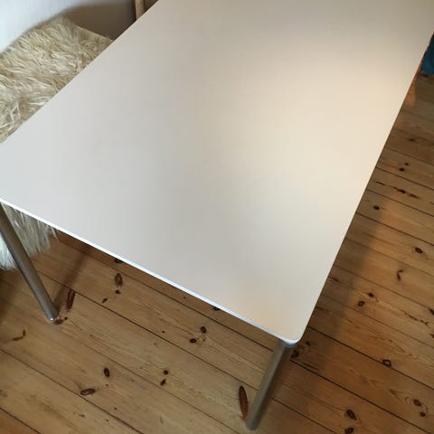 Hvidt bord med rektangulær bordplade, som er breddest på midten og har runde metalben. Bordet har en glat overflade og sølvfarvede metalben. Velegnet til brug i kontormiljøer eller spisestuer.