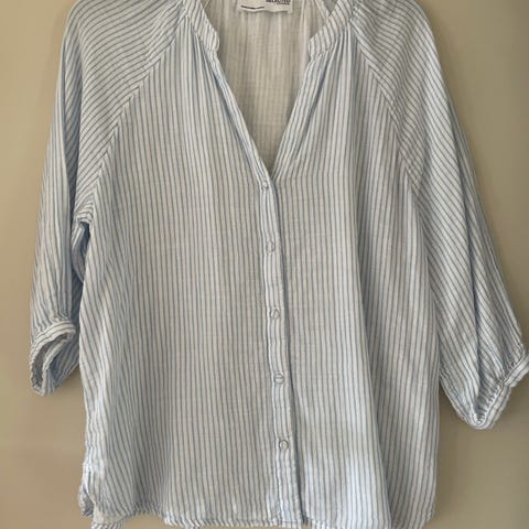 Selected Femme Skjorte i størrelse 34, farve blå og hvid stribet. Skjorten har lange ærmer og knaplukning foran. Let figursyet og falder pæn både åben og lukket. 100% bomuld.