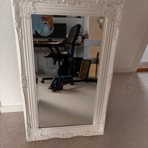 IKEA spejl med hvid ramme. Spejlet har en firkantet form og er designet til vægmontering. Det kan anvendes i forskellige rum til refleksion og dekoration. Mål b 60 x h 68 x d 14.