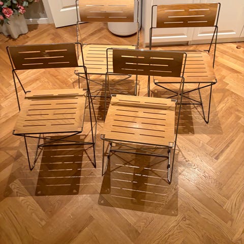 De er meget lidt brugte, ingen rust på stellet, og kun en enkelt afskalning i træet på bagsiden af den ene stol.