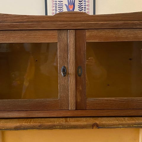 Fint Retro vitrineskab med lameller og hylde. I fyrretræ. Klar til ophæng. Afhentes.