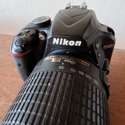 Nikon D3400 SLR Kamera med 18-55 zoom. Kameraet er 24,2 MP digitalt meget velholdt, kun 3489 "clicks". Incl. bæretaske til kamera. Tager også video i Full HD 1920 x 1080. Tager nogen fantastiske billeder.