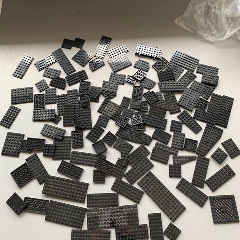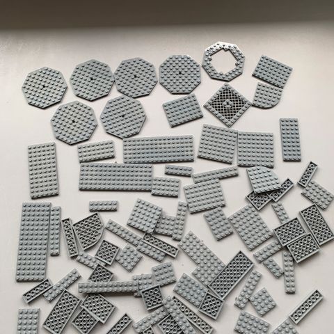 Samling lysegrå og mørkegrå flade plader i forskellig størrelse