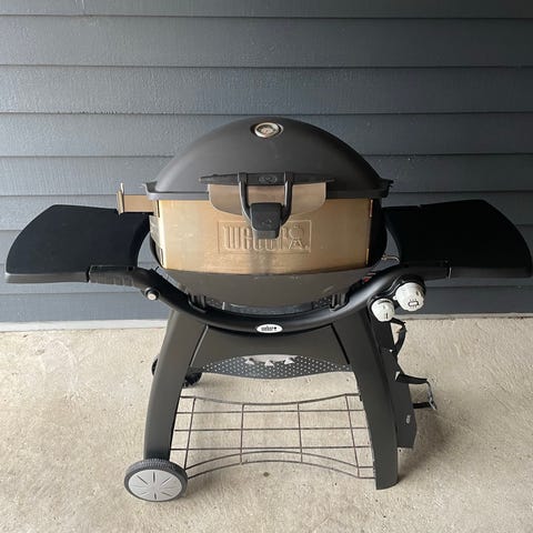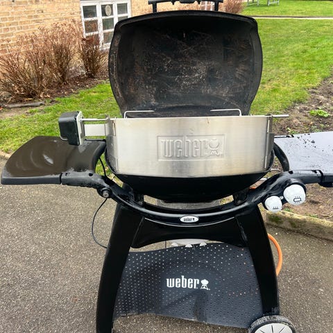Rotisseri, stegeplade og holder til ben, samt overdækken. Den er kun brugt med 1 stk. gasflaske hvor der stadigt er lidt gas tilbage.