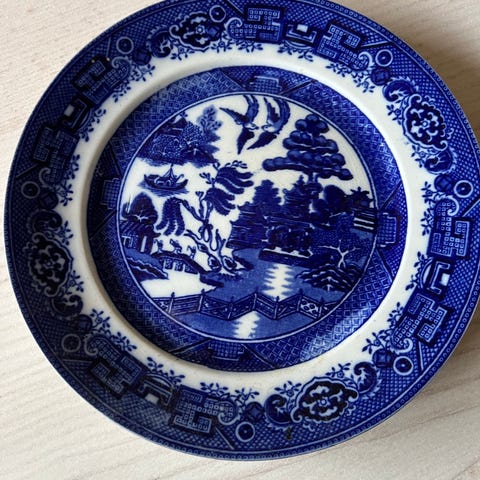 “Sæt på 5 middagstallerkener fra Adderley China, model Delhi Flow Blue Pattern. Ingen skår – fine brugsspor svarende til alder.