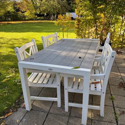 Hvidt træ havebord med fire matchende stole. Bordet og stolene er fremstillet i træ og er malet hvid .Sættet er designet til udendørs brug og egner sig til terrasse eller have. Stole har armlæn og ryglæn med lamel-design. Har altid stået inde i en udestue.